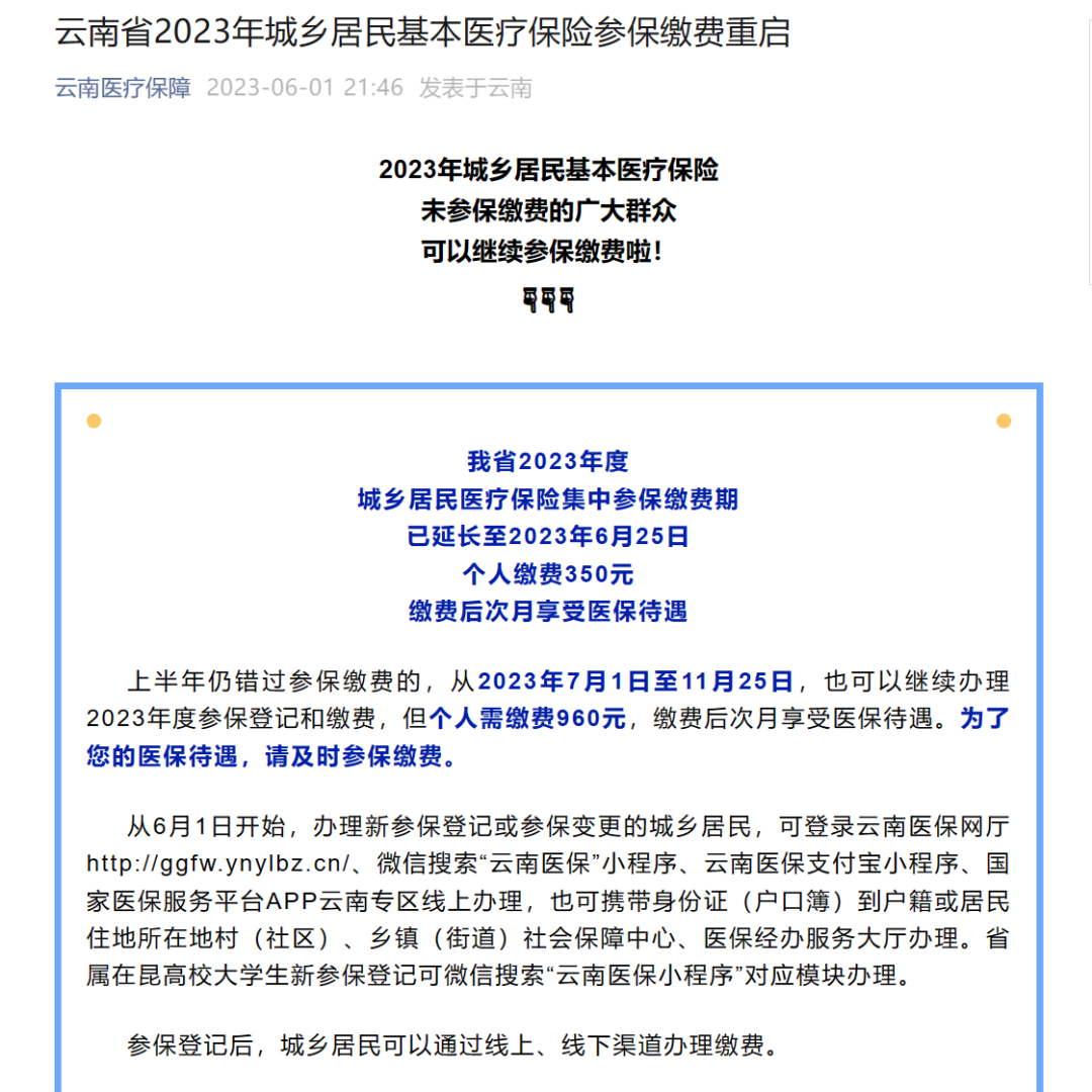 日前,云南省医疗保障局发布消息:云南省2023年城乡居民基本医疗保险参保缴费期已延长至2023年6月25日,个人缴费350元,缴费后次月享受医保待遇。